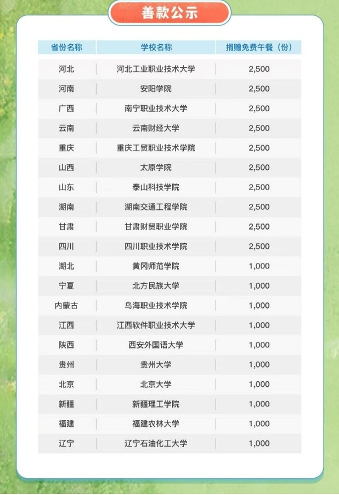 本次活动中,学校积极响应活动号召,通过微博、短视频等渠道动员广大师生投身公益实践,搭建公益桥梁,助力公益微光,在为期15天的公益周期内,学校师生不间断助力,为湖南省衡阳市衡南县花桥联合学校渚溪校区乡村学童捐赠“爱心午餐”2500份,助力偏远地区儿童解决用餐难题。此次荣誉不仅展现了球速·体育青年学子的社会责任感和青春担当,也为公益事业注入了温暖力量。活动后,微博协会负责人张茂林表示“这不仅是一次物资捐赠,更是一堂生动的思政实践课”。