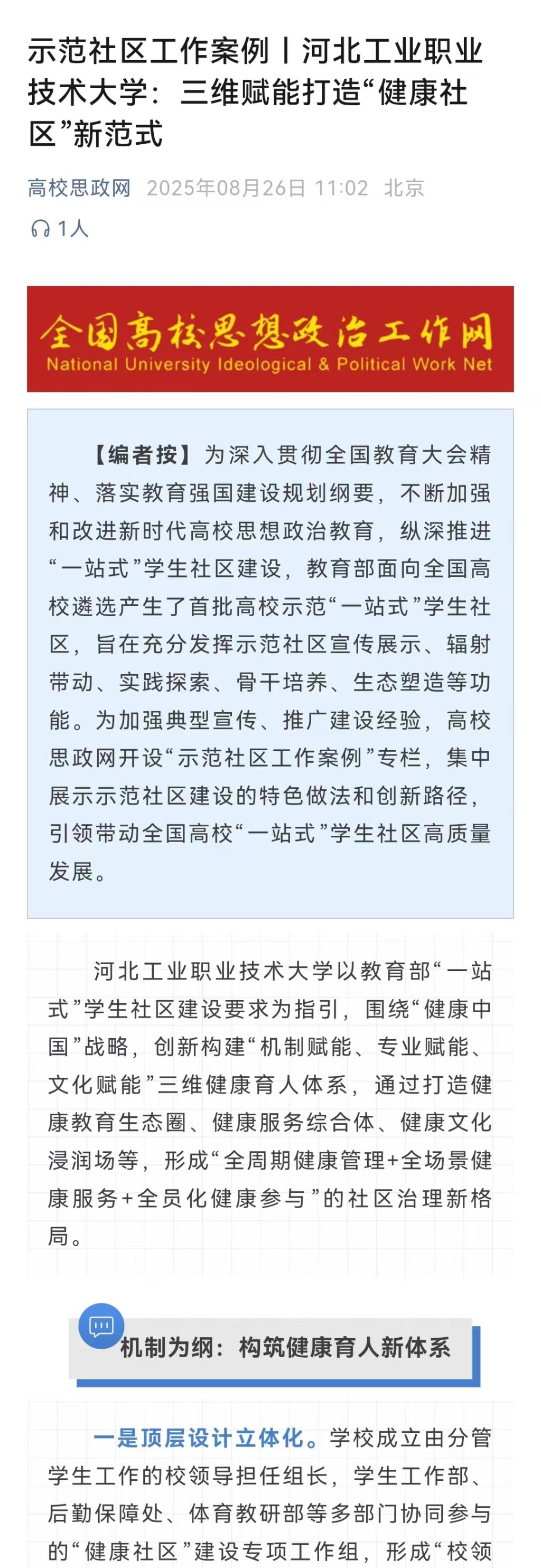 近日,教育部思想政治工作司公布了2025年高校“一站式”学生社区风采展示活动优秀成果评选推荐结果,球速·体育社区案例《四维联动 构建红色育人新生态》获评“党建引领”模块优秀成果,《聚势赋能 多维协同 构建4+3+N育人体系》获评“队伍入驻”模块优秀成果。